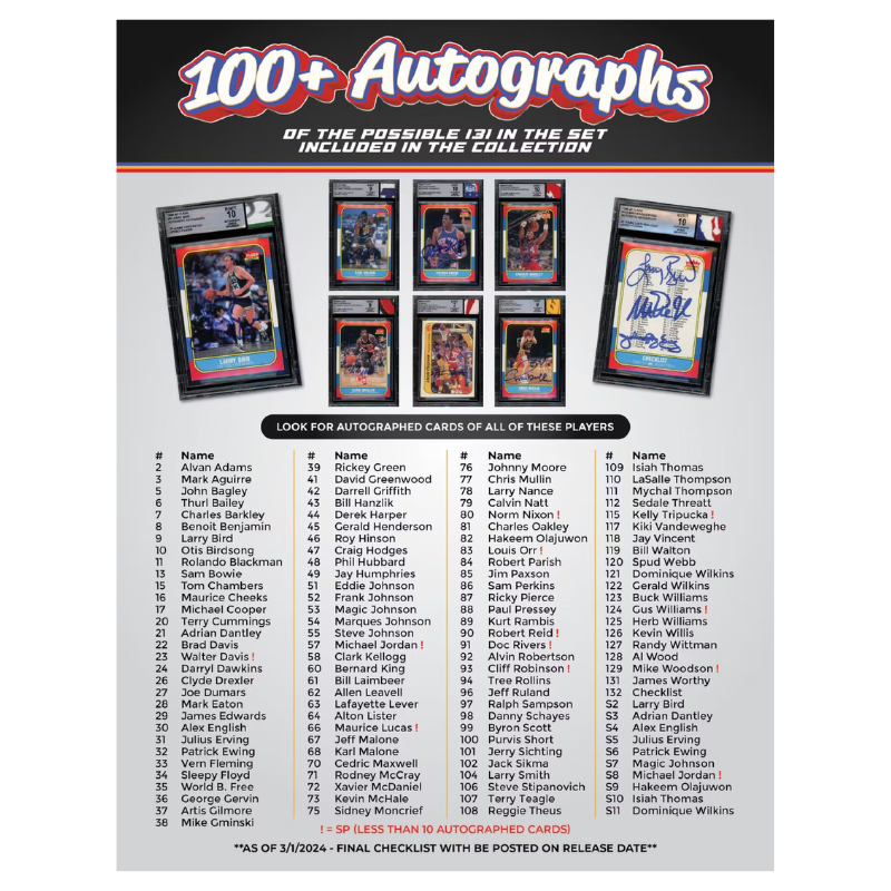 Our JF tradition of including a QR code on the back of these holders brings collectors to a webpage hosting all of the authentication information and the original memorabilia piece images. Every card and sticker in the original Fleer series is included with at least 50 complete sets, checklists with multiple premium autographs, and 125 Michael Jordan RCs!